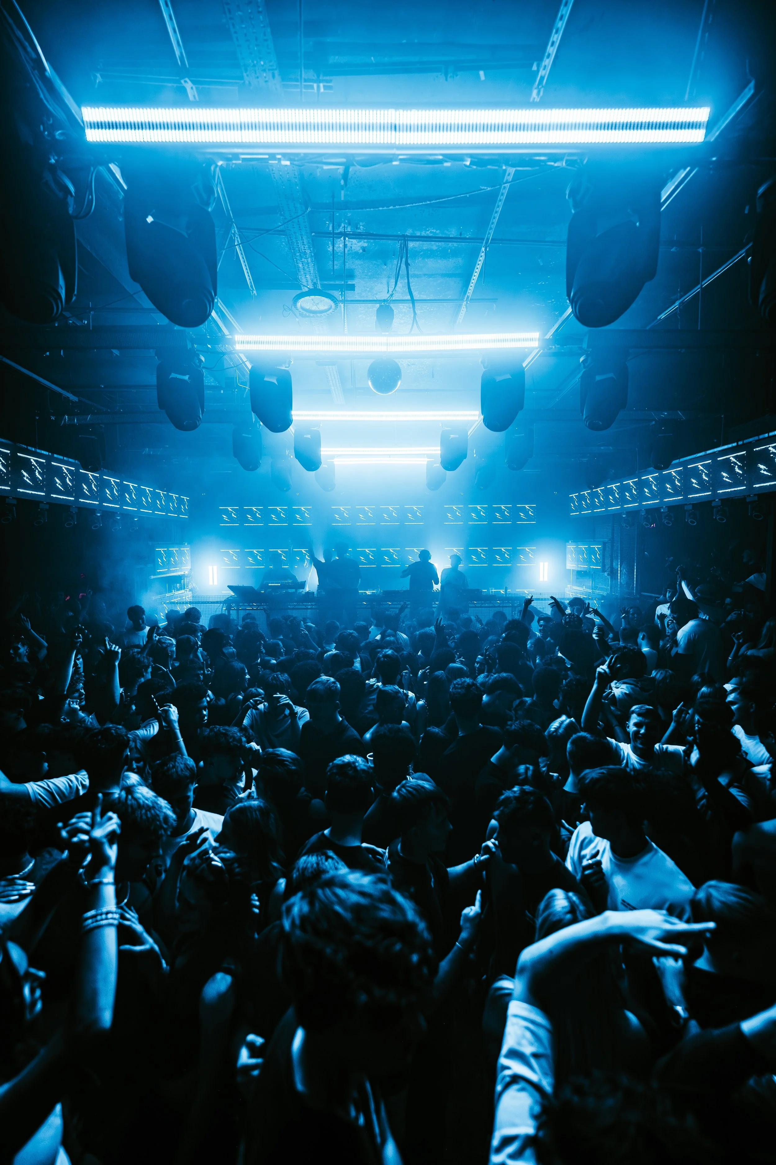 A grid of strobes and light bars frame the industrial caged DJ booth, placing the focus on the artist.